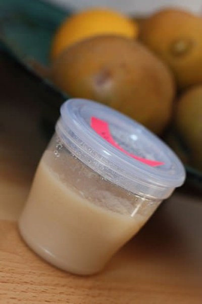 Même principe que pour les légumes, on intègre les fruits les uns après les autres pour voir s’il ne fait pas d’allergies. Pour les premiers fruits, on devait se contenter des fruits de saison, surtout pas de fruits exotiques, ni fruits rouges, ni kiwi, ni banane, bref en plein hiver c’est un peu triste, mais on a réussi à varier un peu !