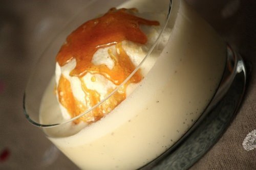 J’ai préparé ma crème la veille et je l’ai conservée dans une bouteille au réfrigérateur. Au dernier moment il ne reste qu’à secouer la bouteille et la verser directement dans des coupes. Cette recette est parfaitement réalisable au thermomix, 7 minutes de cuisson, 80°, vitesse 4 puis un mixage puissance maxi 5 secondes en fin de cuisson.