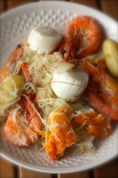 Un p’tit détour au rayon poissonnerie du supermarché hier soir avant d’aller faire mes 40 longueurs à la piscine (30 minutes chrono ! trop contente je m’améliore) j’avais tout ce qu’il me fallait pour faire une délicieuse choucroute que j’ai réalisé en revenant, grace à ma cocotte minute qui m’a permis de faire cuire ce plat en 40 minutes, le temps de prendre le relai avec mon chéri pour m’occuper de mon p’tit bonhomme, le faire manger, lui raconter une histoire et le coucher. Après mon marathon courses / piscine / baby après ma journée de boulot mon plat est cuit et il est temps pour moi de me poser et de déguster ce plat délicieux et léger, avant de prendre quelques minutes pour programmer ma recette sur mon blog.
