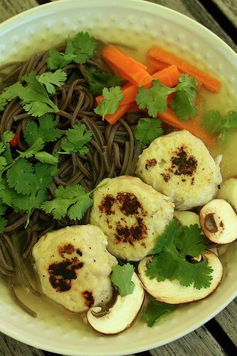 4. Egoutter les nouilles, les répartir dans des assiettes à soupe. Ajouter les boulettes de poulet, les batonnets de carottes, les champignons et la coriandre ciselée. Rajouter une ou deux louches de bouillon bien chaud au dernier moment.