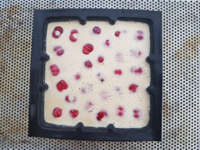 3. Rincer les cerises, les déposer sur dans un petit moule à manqué. J’ai utilisé mon petit moule tablette Guy Demarle. Recouvrir avec la préparation à clafoutis.