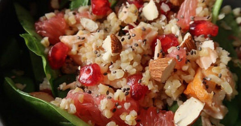 Dans un saladier, mélanger le boulgour, les morceaux de pamplemousse, les graines de grenade et de chia.