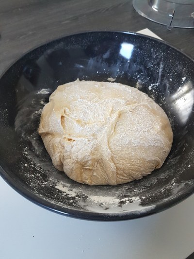 - 20 h 55 : Récupération de la pâte avec la corne, dépot dans un saladier légèrement fariné. Couvrir le saladier de film transparent alimentaire, laisser lever la pâte pendant 1 heure dans une pièce chaude. Mon four avait chauffé pendant le repas, j’ai posé le saladier sur la porte, ouverte.