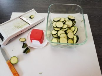 Pour un carpaccio de courgettes réussi, il faut que les courgettes soient coupées en fines rondelles régulières. Et là il n’y a pas 50 solutions, la mandoline sera votre meilleur amie.