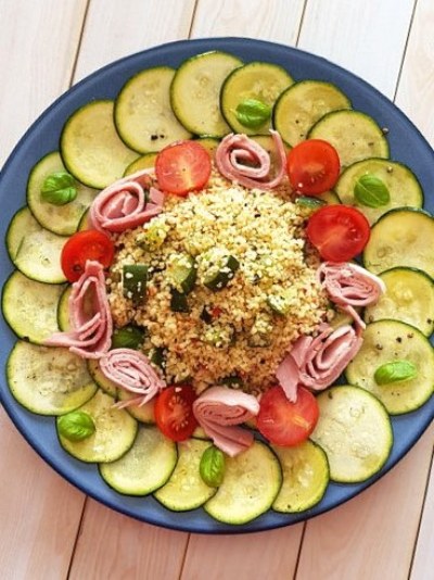 Avec un reste de taboulé, du jambon blanc et quelques cerises, il fait également une délicieuse assiette fraicheur pour un déjeuner. Et vous vous l’aimez comment le carpaccio de courgettes ?