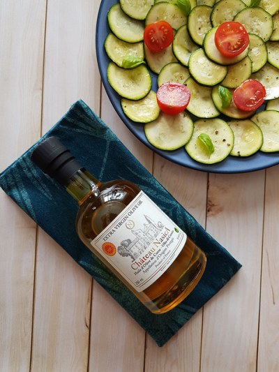 Comme je ne reviens pas de vacances sans produits gourmands, pour cette recette j’ai utilisé une très belle huile d’olive Corse, Château Nasica, au goût herbacé bien prononcé.