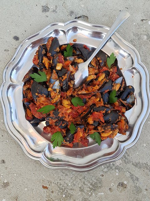 Lassés des moules marinières [1] ou des moules à la plancha [2] ? Cette recette est pour vous. Imaginez, une sauce tomate faite maison, mijotée avec des herbes fraîches du jardin, des morceaux de chorizo bien relevé, un peu d’ail et d’oignon pour parfumer le tout et des moules qui s’imbibent de tous ces parfums.