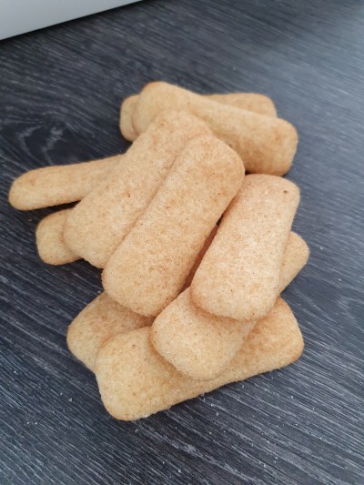 Dans mon adaptation, j’ai enlevé un oeuf, je n’aime pas quand il y a trop de jaunes dans le tiramisu, je trouve ça écoeurant. J’ai utilisé des petits biscuits Italiens à Tiramisu, des Pavesini. Ces biscuits n’ont rien à voir avec les biscuits cuillères qui sont trop mou, ni les boudoirs trop épais, même si on se rapproche plus de ses derniers.