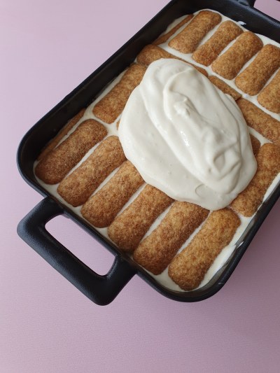 Les Pavesini sont fins comme des speculoos, assez sucrés et très croquants. Ils conservent bien leur forme quand ils sont imbibés de café. Et ce que j’adore c’est leur épaisseur : comme ils sont fins, on peut facilement faire trois épaisseurs de biscuits et de crème pour un résultat totalement équilibré dans les différentes couches. Si vous en trouvez n’hésitez pas à en acheter !
