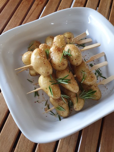 - Rincer les pommes de terre, les enfiler sur des pics à brochettes.