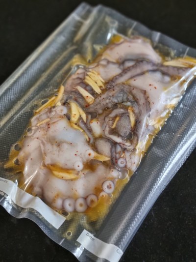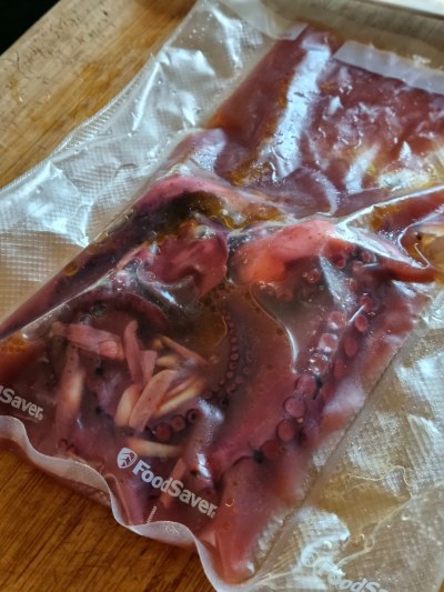 Pour la cuisson sous vide j’utilise mon appareil de mise sous vide et des sachets que je soude avec ma machine. Je peux les faire cuire sans problème. Le secret de la tendreté du poulpe c’est de le faire cuire sous vide, à une température de 82 à 85° maximum.
