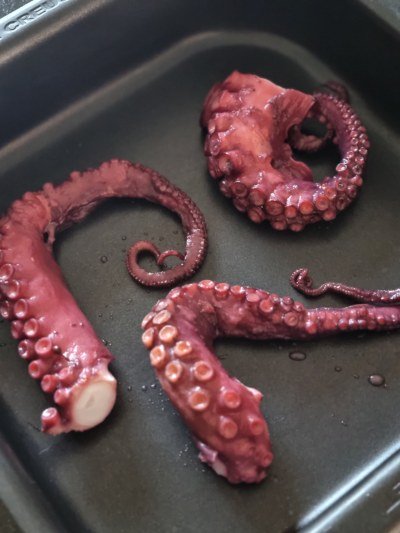 Je n’achète jamais un poulpe entier, c’est trop pour notre consommation, mais un morceau de plusieurs tentacules. Et donc là je n’ai rien à faire, le poissonnier a fait son job. Je n’ai qu’à le congeler puis le faire cuire.