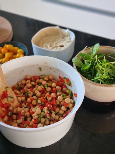 1. Egoutter et rincer les pois chiches et les déposer dans un saladier.