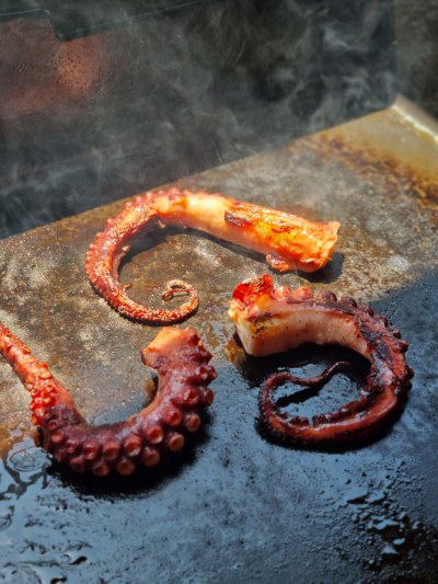 J’ai demandé quelques astuces au Chef pour une cuisson réussie du Poulpe et il m’a révélé qu’il le faisait cuire sous vide (avec un peu d’huile et de condiments) pendant quelques heures, 6 si ma mémoire est bonne.