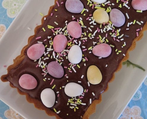Pour mon repas de Pâques, je ne pouvais pas ne pas proposer un dessert au chocolat, même si plusieurs invités autour de la table n'aiment pas ça (non mais franchement, comment faites vous pour ne pas aimer le chocolat ??). Alors en plus d'une tarte meringuée au fruit de la passion (elle va bientôt arriver sur le blog), voici une tarte au ...